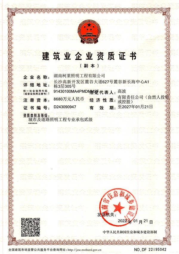 祝贺湖南304am永利集团照明工程有限公司成功获得二级建筑企业资质证书